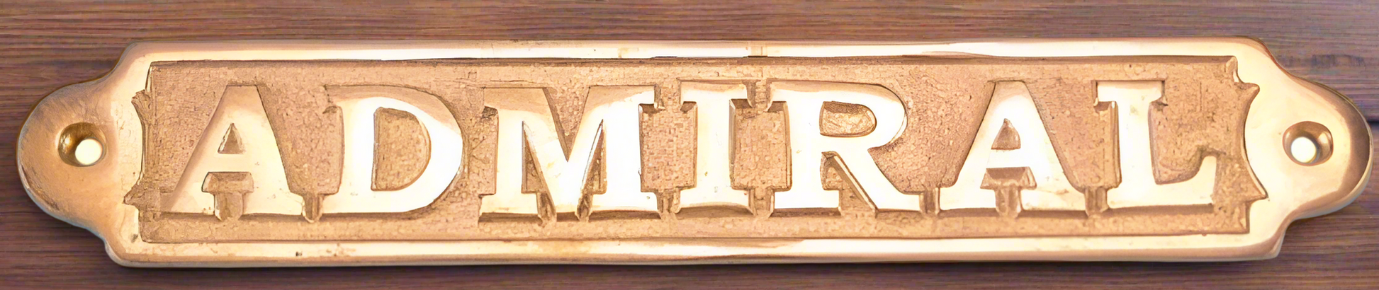 Crafted from solid brass, this 'Admiral' plaque features a gold-coloured finish with raised lettering for clear visibility and durability. Measuring 19cm wide by 3cm high, it includes two pre-drilled holes and screws for straightforward mounting. Ideal for adding a distinguished touch to any space with reliable construction and elegant design.