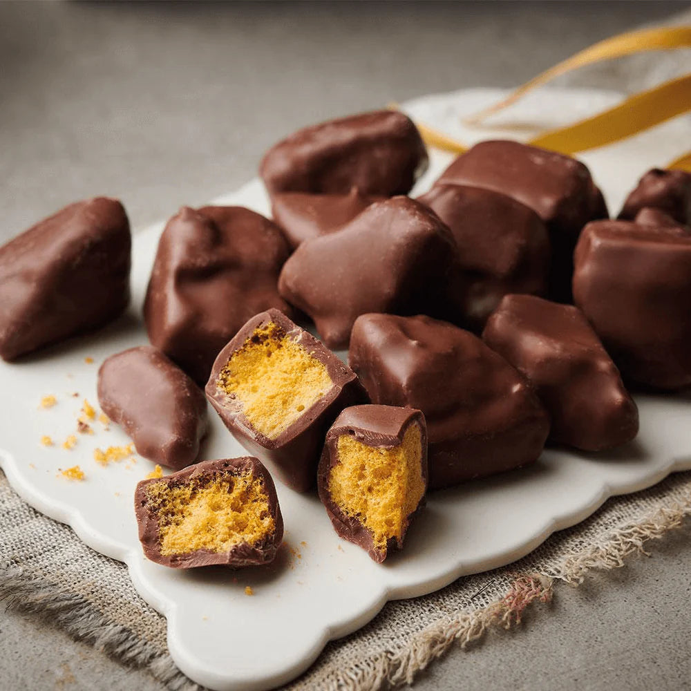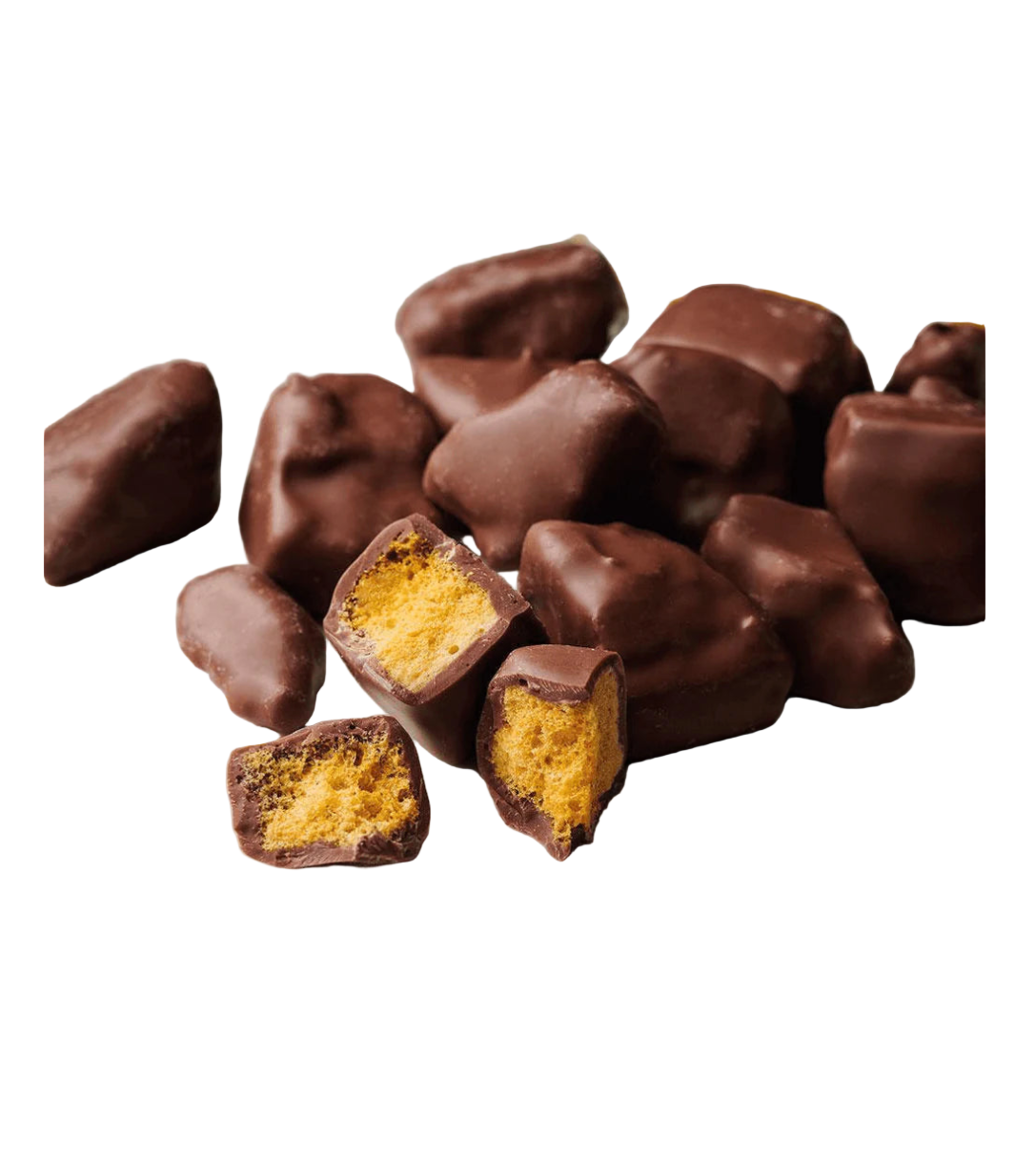 Sugar Honeycomb (55%) (sugar, glucose syrup, bicarbonate of soda, rice flour), chocolate flavour coating (45%) (sugar, vegetable fat (palm), whey powder (MILK), fat reduced cocoa powder, emulsifiers: sorbitan tristearate, SOYA lecithin; flavouring). Contains sulphites.