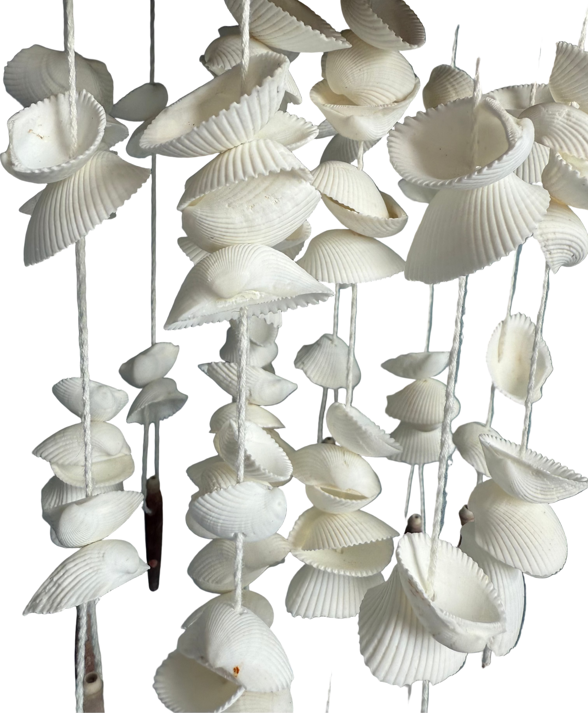 Crafted from a polished half coconut, this Coco Shell Windchime features delicate white shells suspended below, creating a natural and elegant decorative piece.
