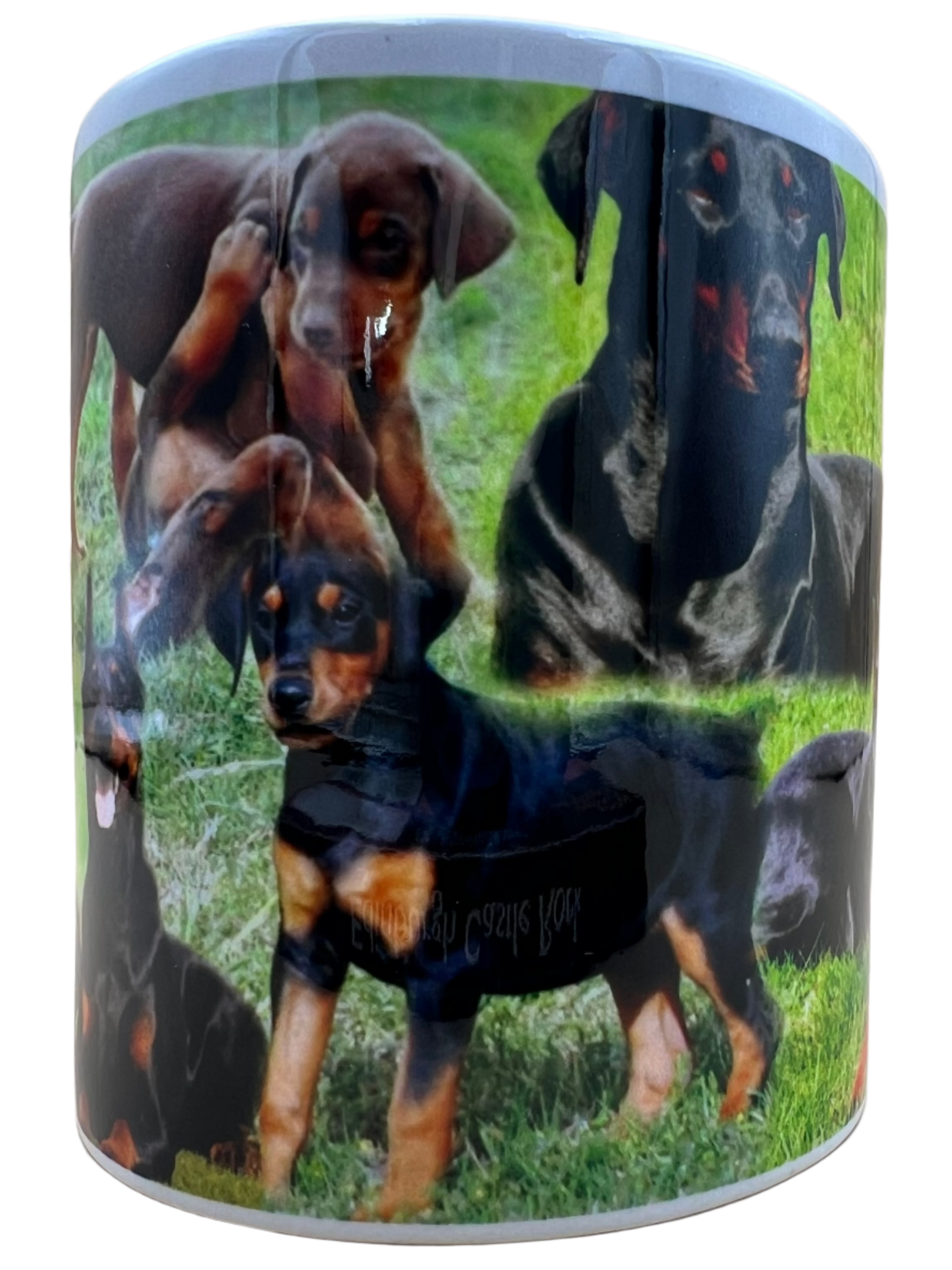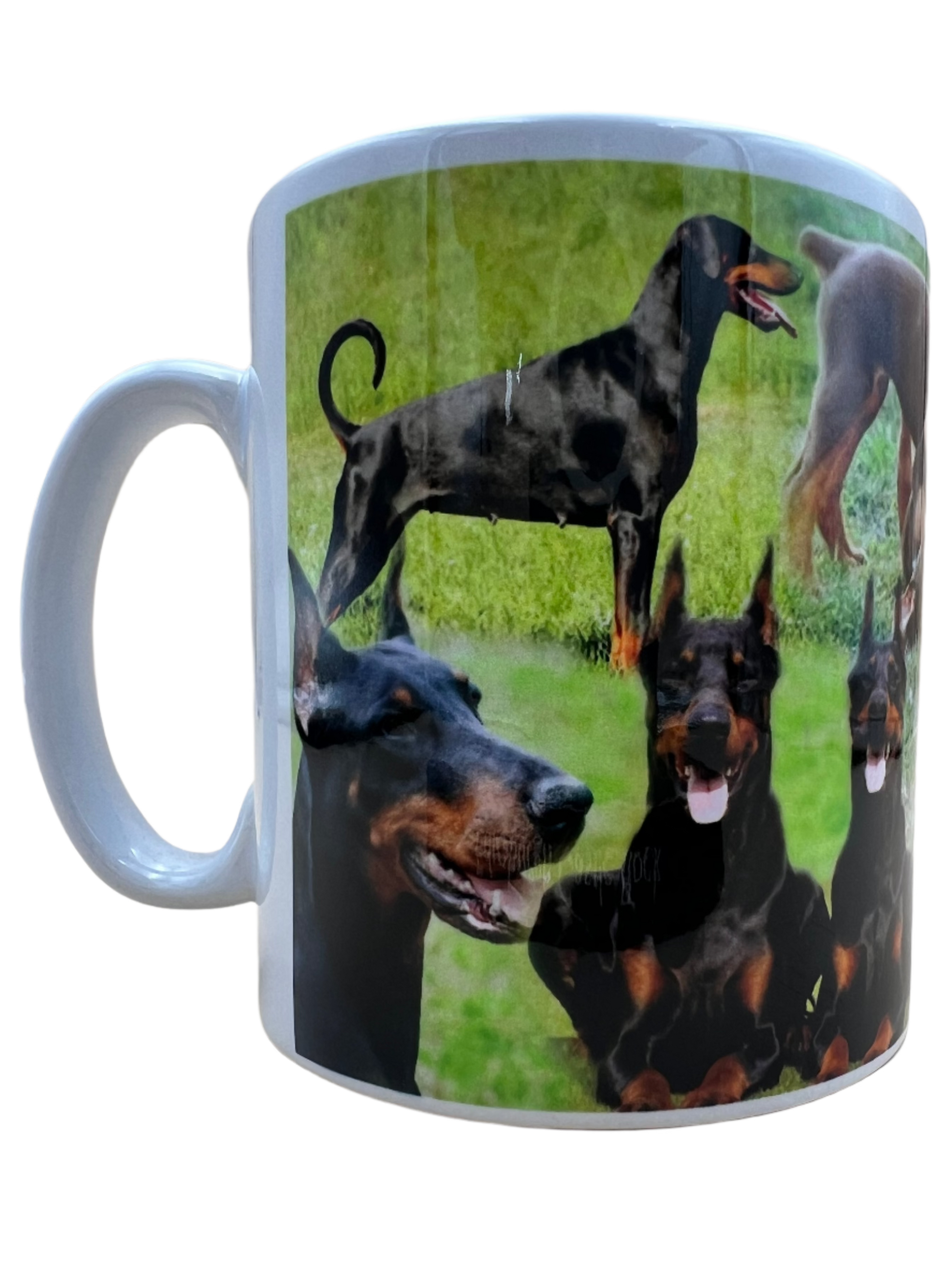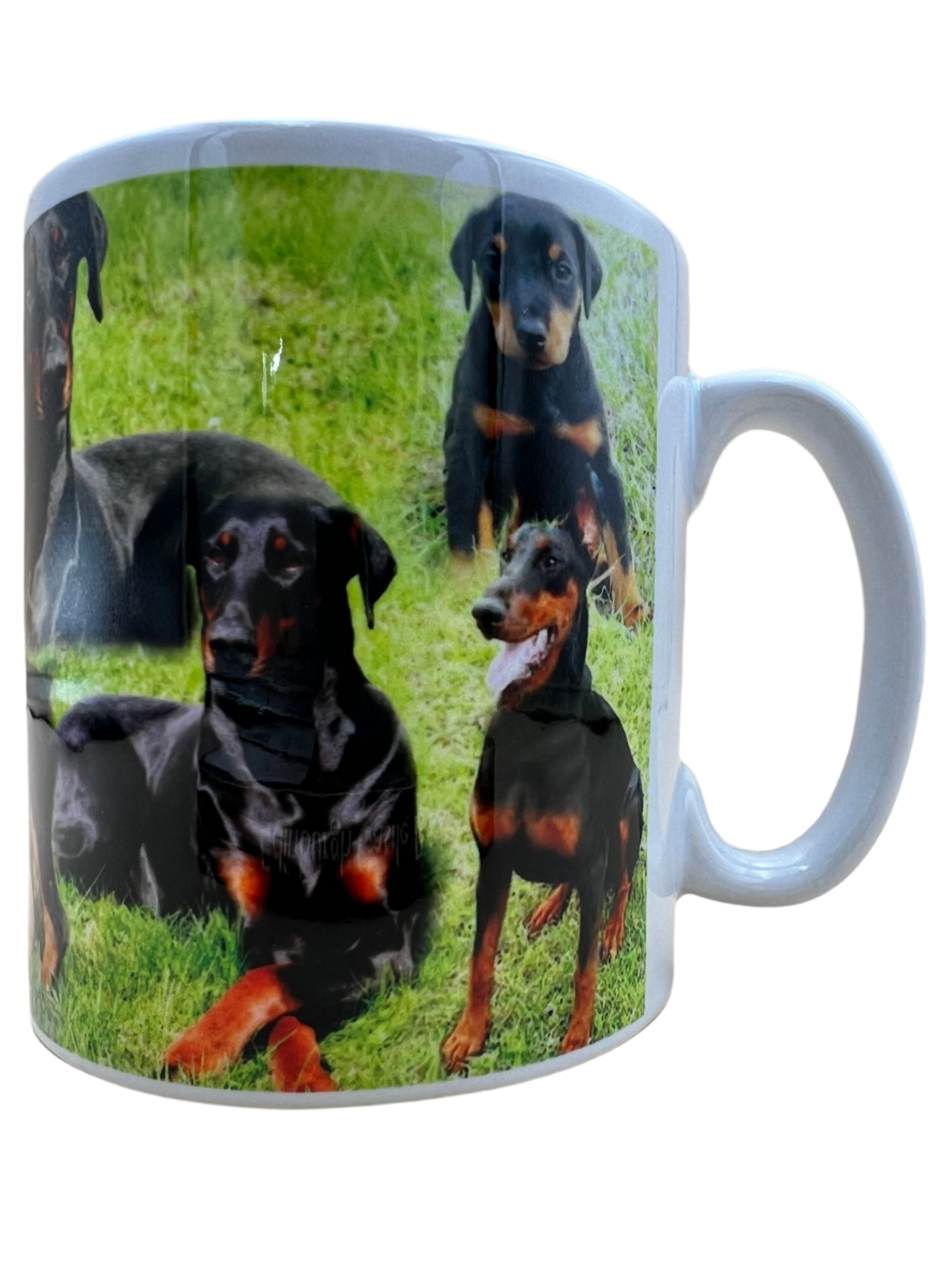 This expertly crafted mug features a striking wrap around design of loyal Dobermans, perfect for any dog lover. Made from high-quality materials, this mug is durable and functional, making it a great addition to any kitchen. Enjoy your morning coffee or tea in style with this unique and elegant dog mug.
