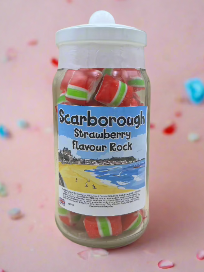 Indulge in the classic taste and quality of our Jar of Strawberry Rock. Handmade in the UK, each jar contains 145g of this classic treat in a resealable glass jar.