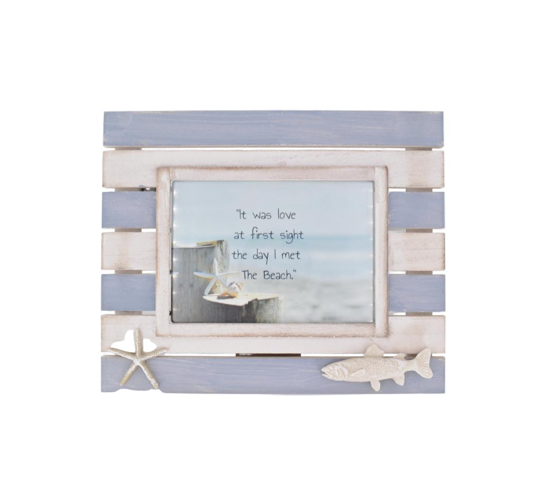 This driftwood-style photo frame combines natural textures with a soothing palette of blue and cream, creating a refined coastal charm.