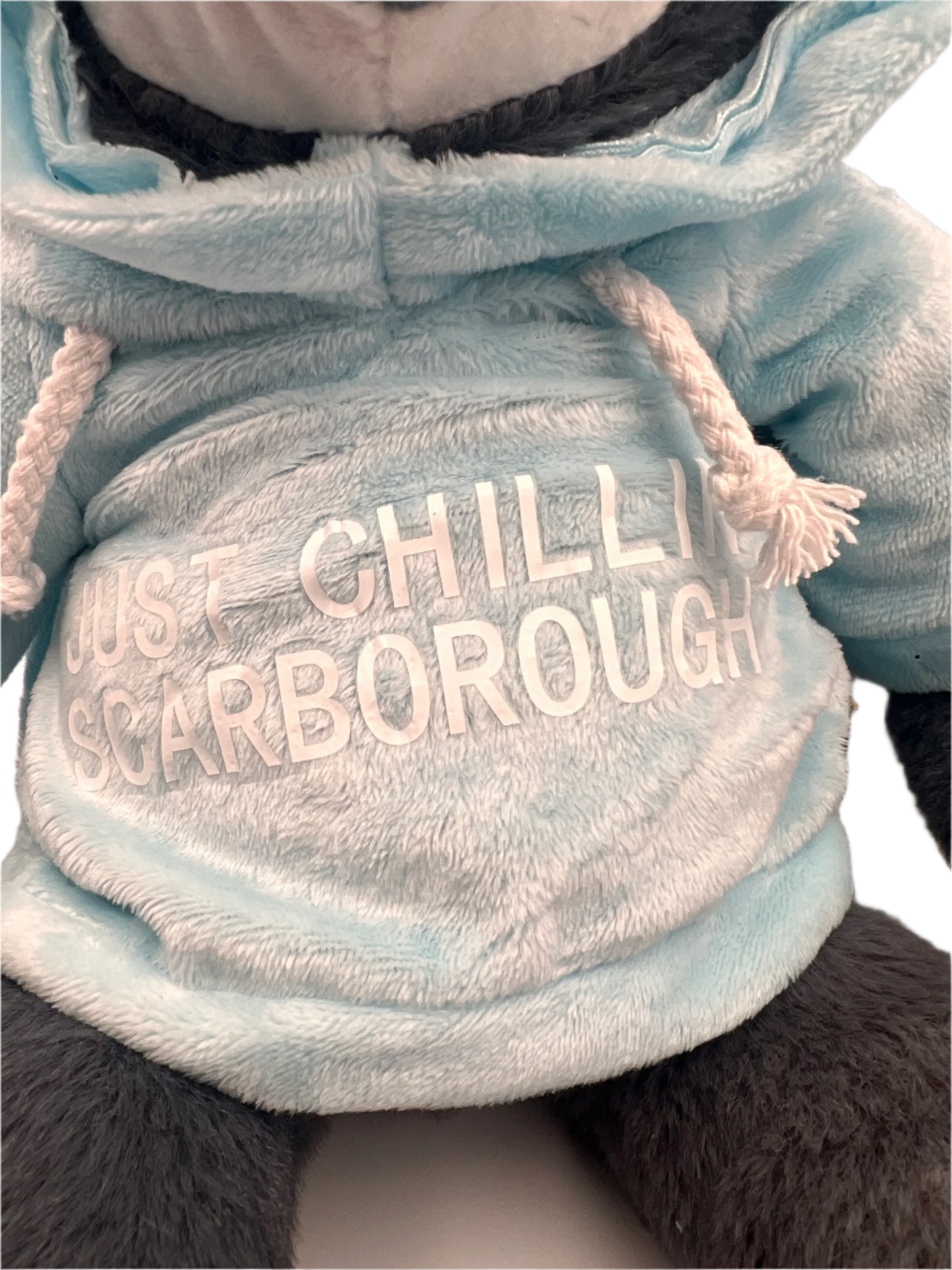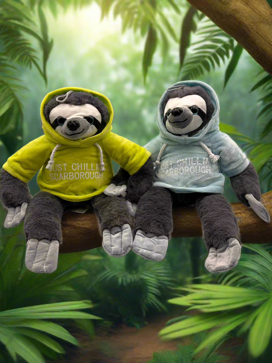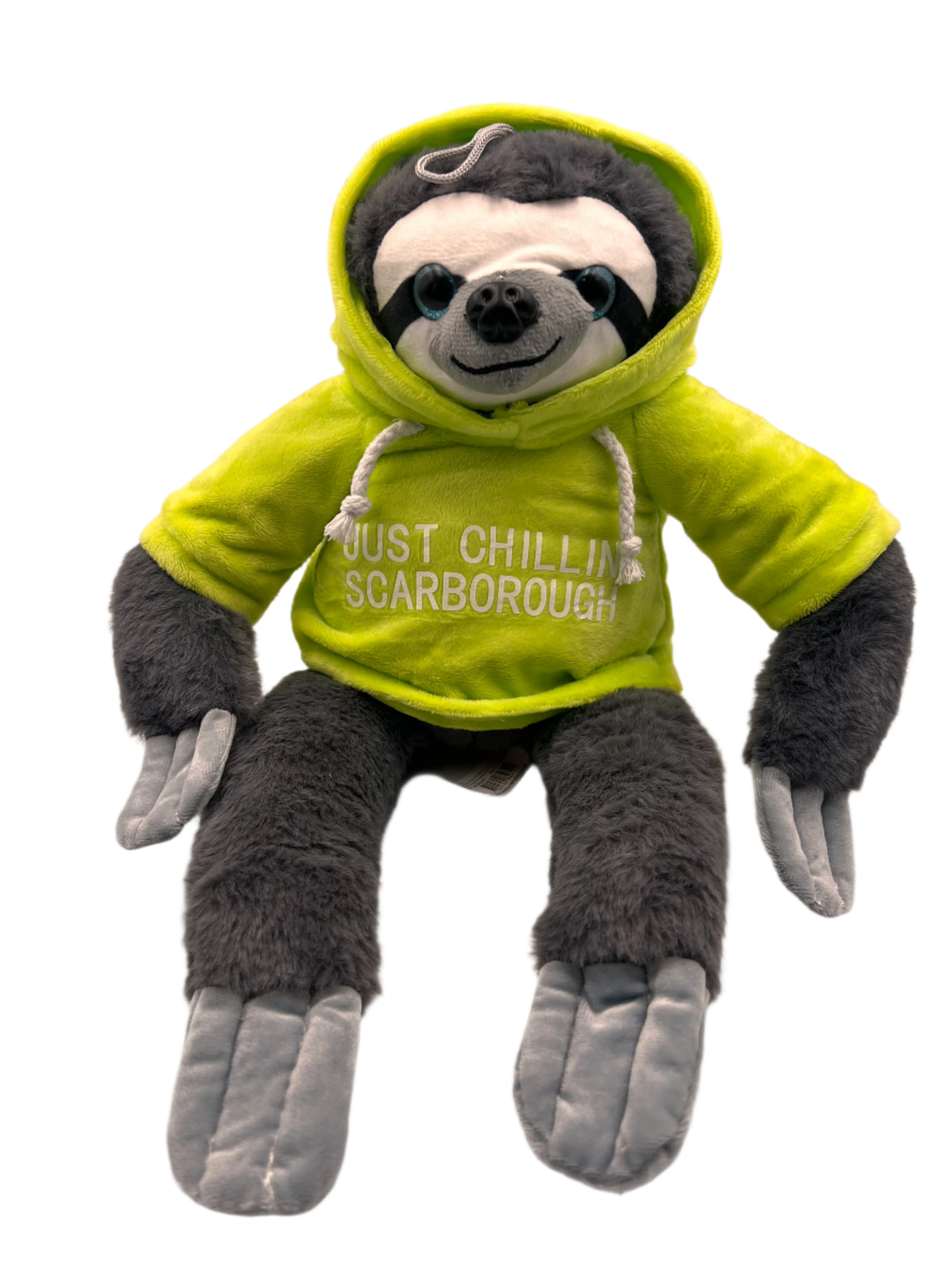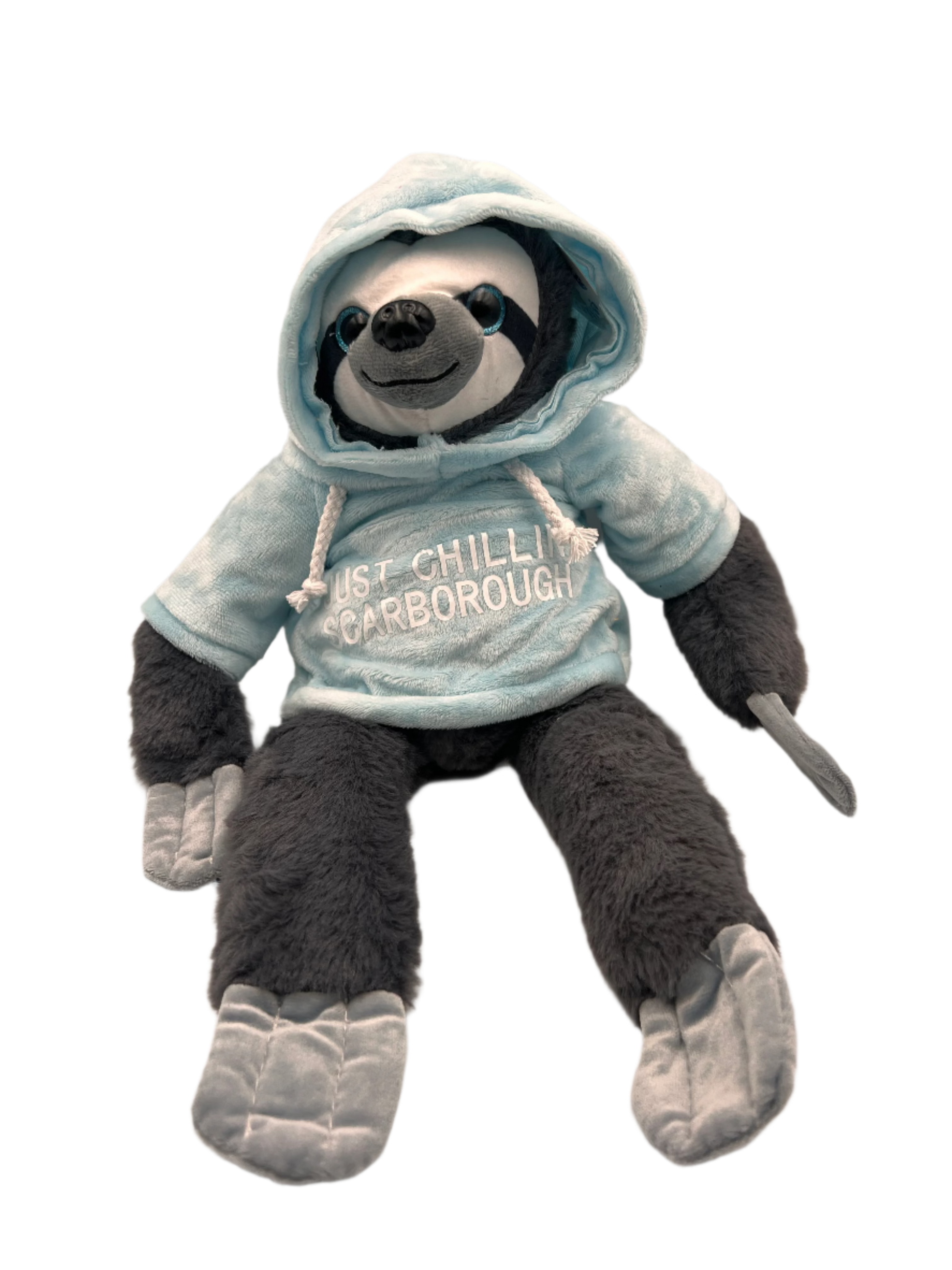 This 41cm tall soft toy features a cute sloth wearing a hoodie with the playful slogan "just chillin' Scarborough."