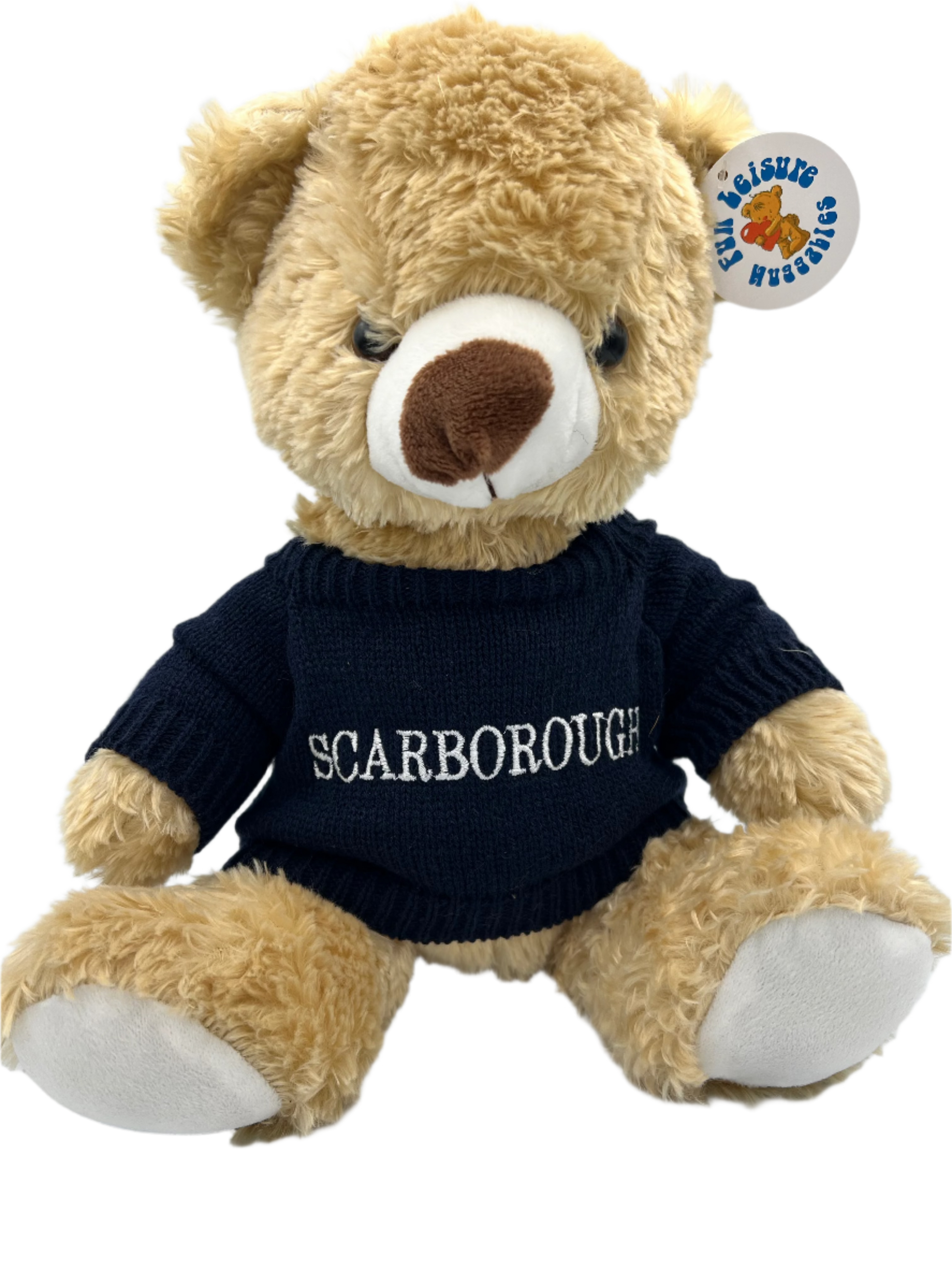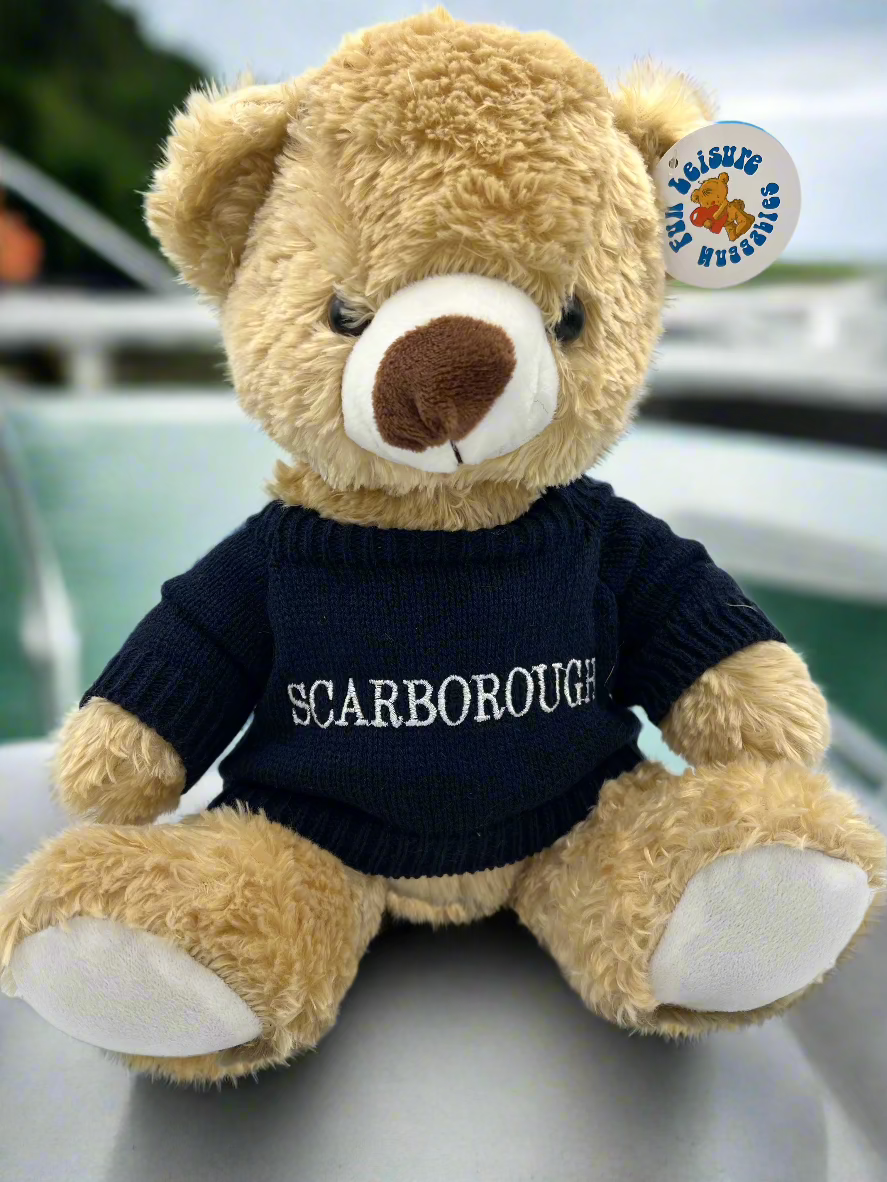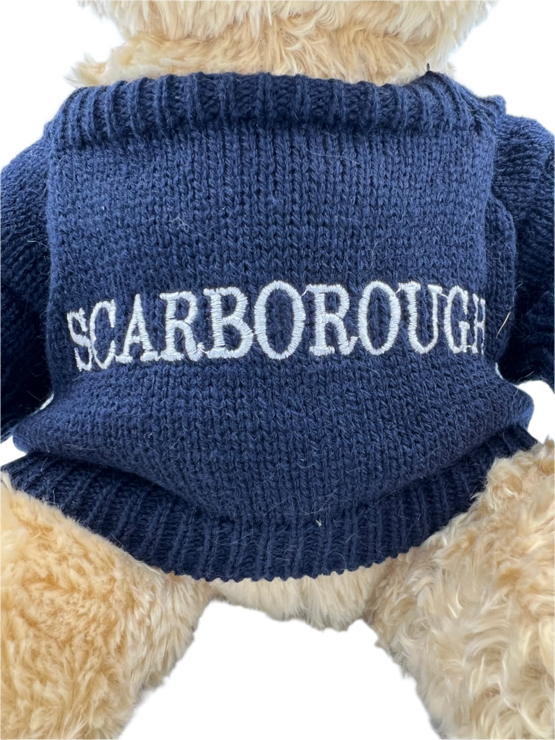 The removable jumper adds a fun element, featuring the embroidered word "SCARBOROUGH," making it a unique souvenir or gift.