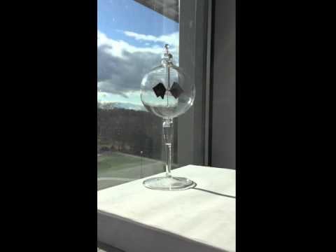 Inside, lightweight vanes spin when exposed to light due to thermal transpiration—where air molecules move more rapidly on the heated black surfaces than the cooler white sides. This creates a pressure difference that causes the vanes to rotate, illustrating the conversion of light energy into motion.