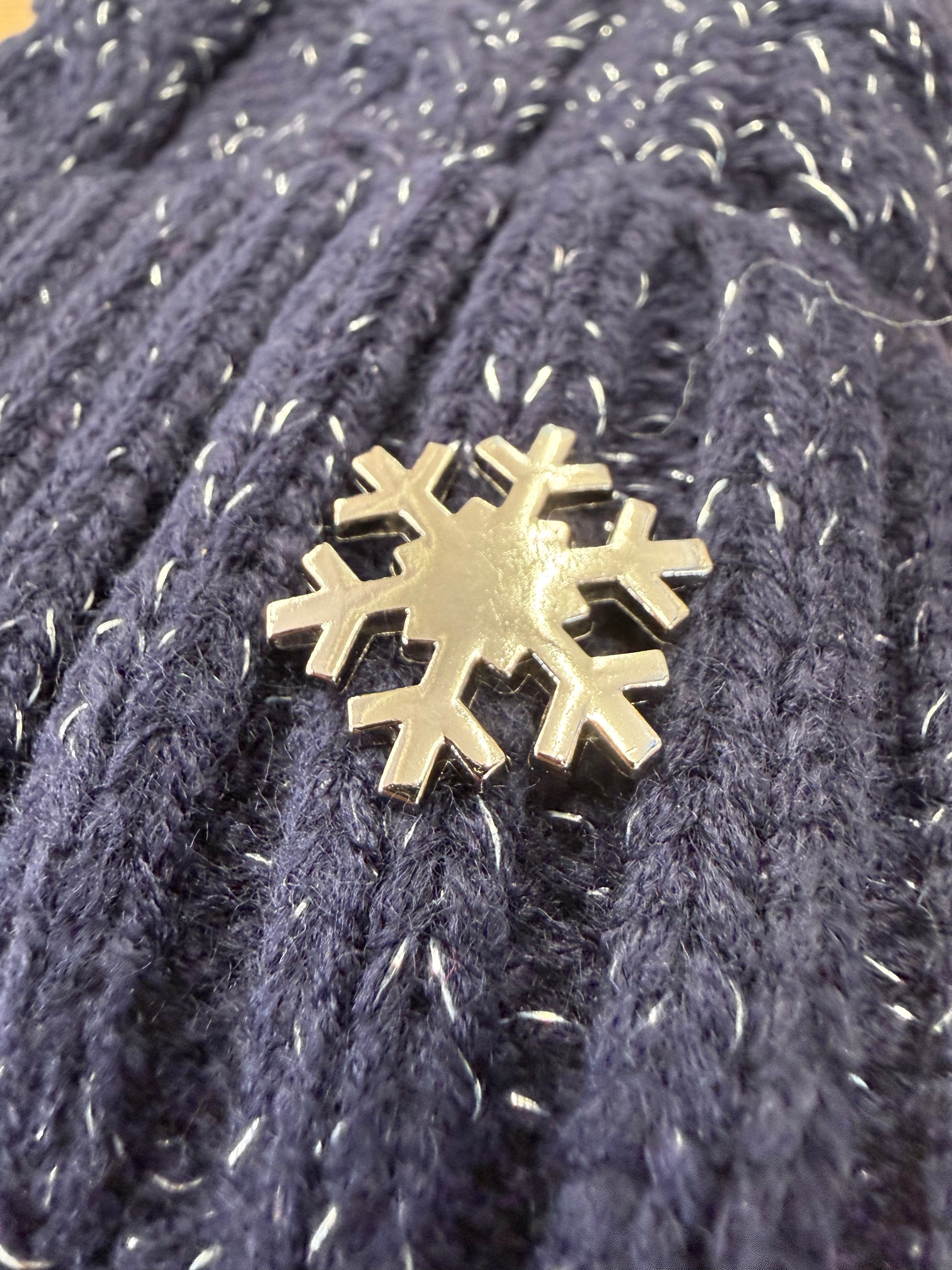A wonderfully warm bobble hat with sparkle effect wool, and metal snowflake badge. The faux fur bobble is removable so the hat can be worn comfortably when your coat hood is up.