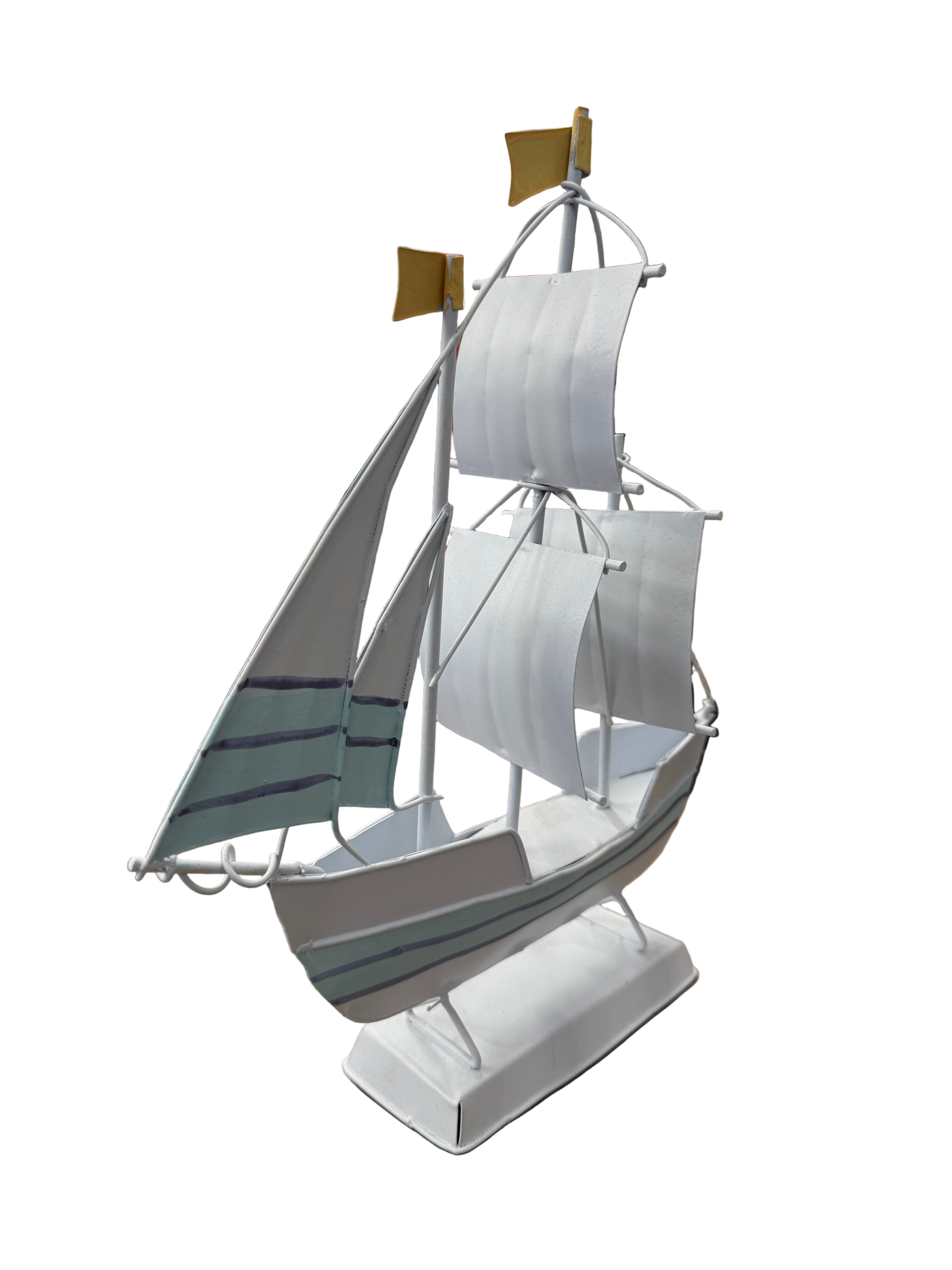 This 35cm tall metal model ship features a rustic finish with a white and blue color scheme, combining vintage charm with precise craftsmanship.
