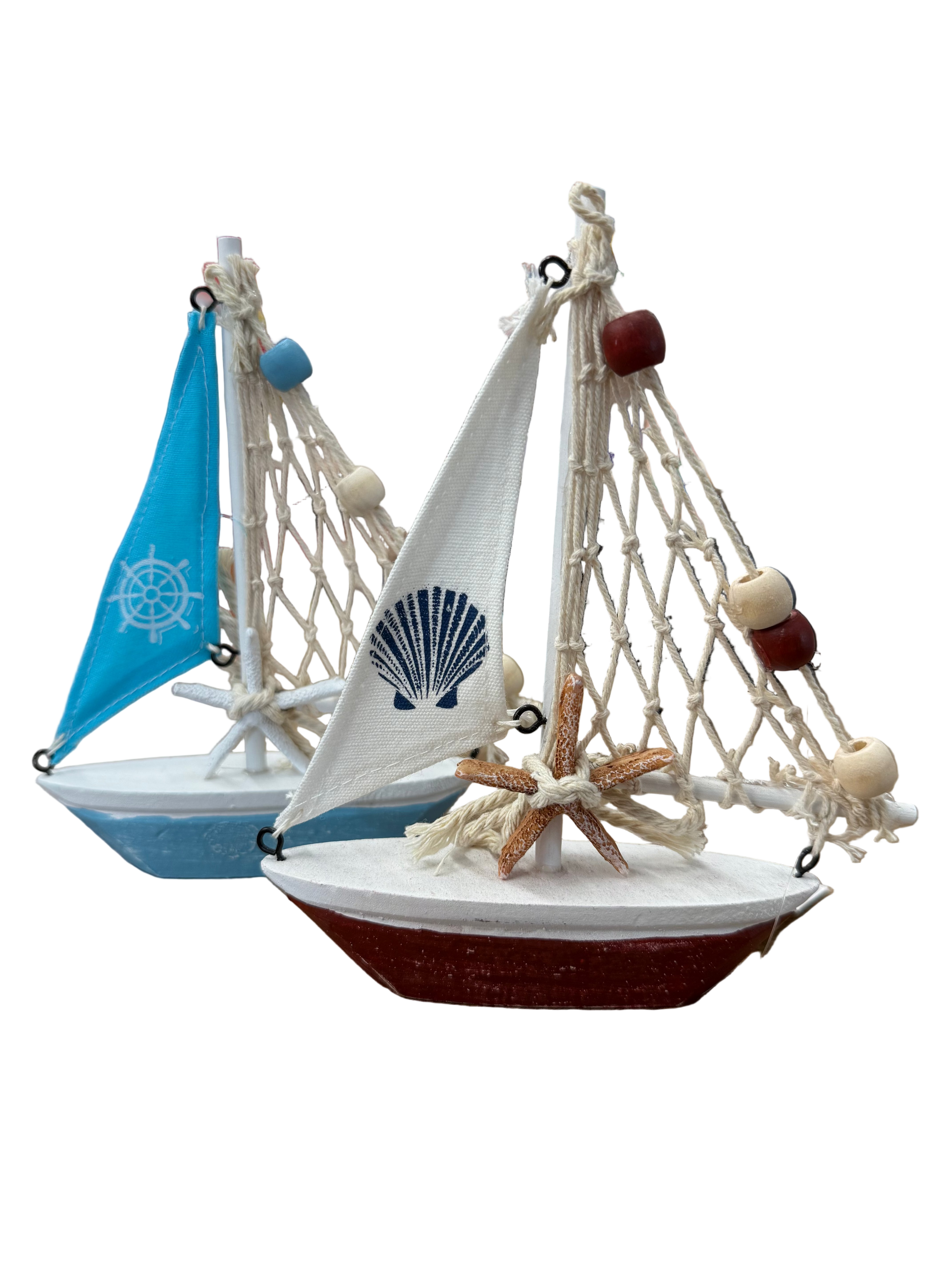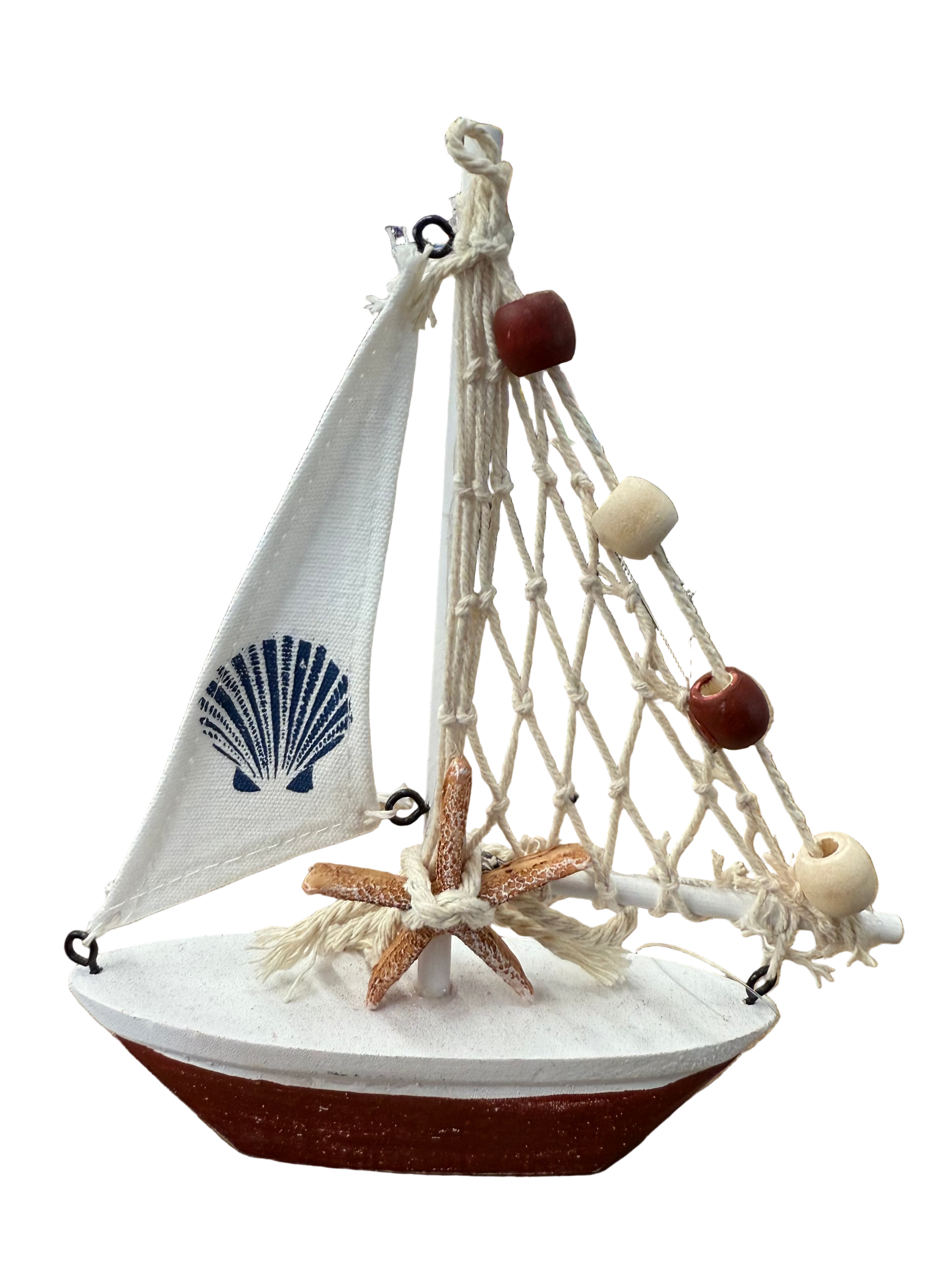 This 18cm by 15cm wooden yacht features intricately carved details and fabric sails, accented by a miniature resin starfish attached to the mast.