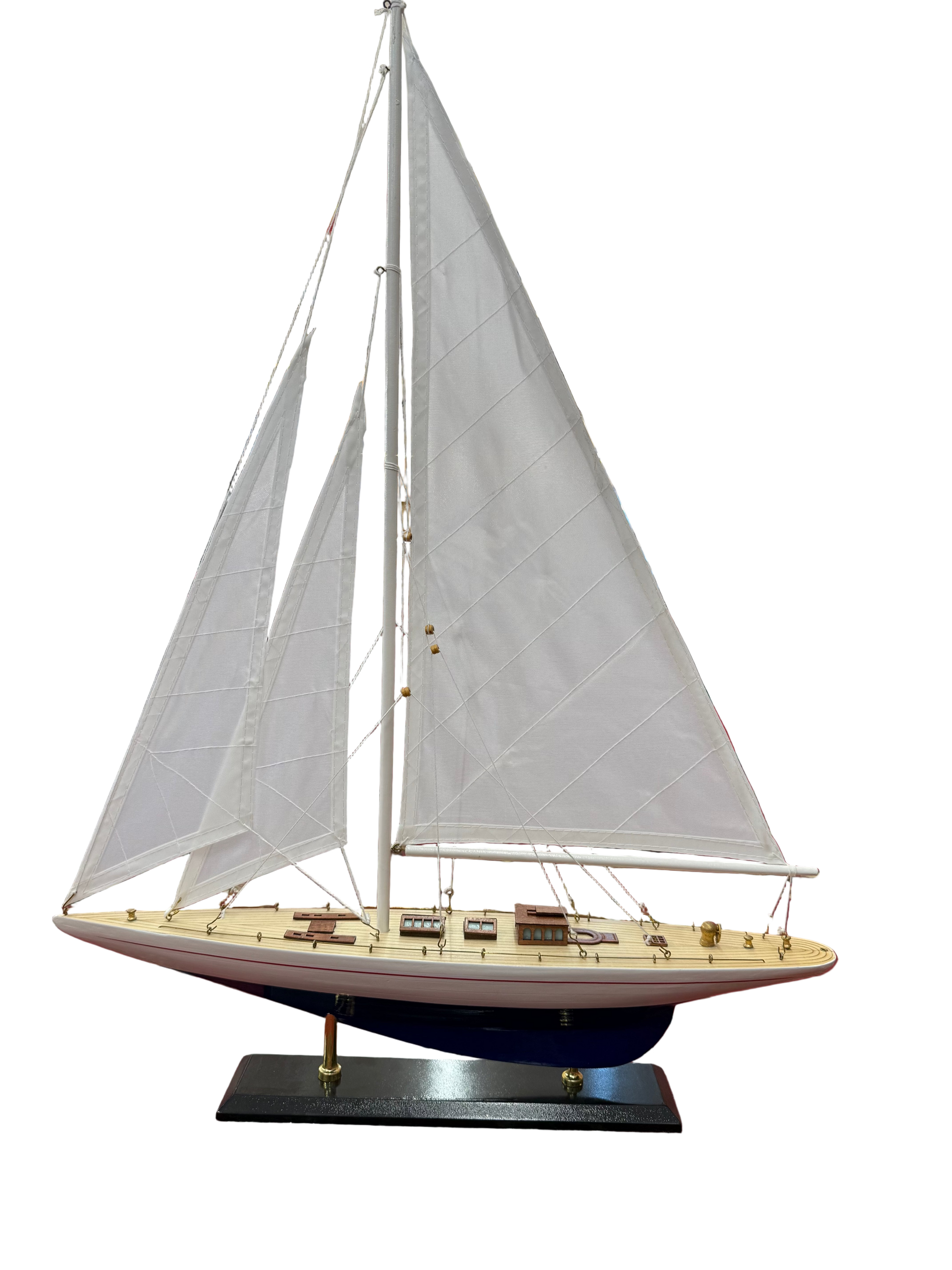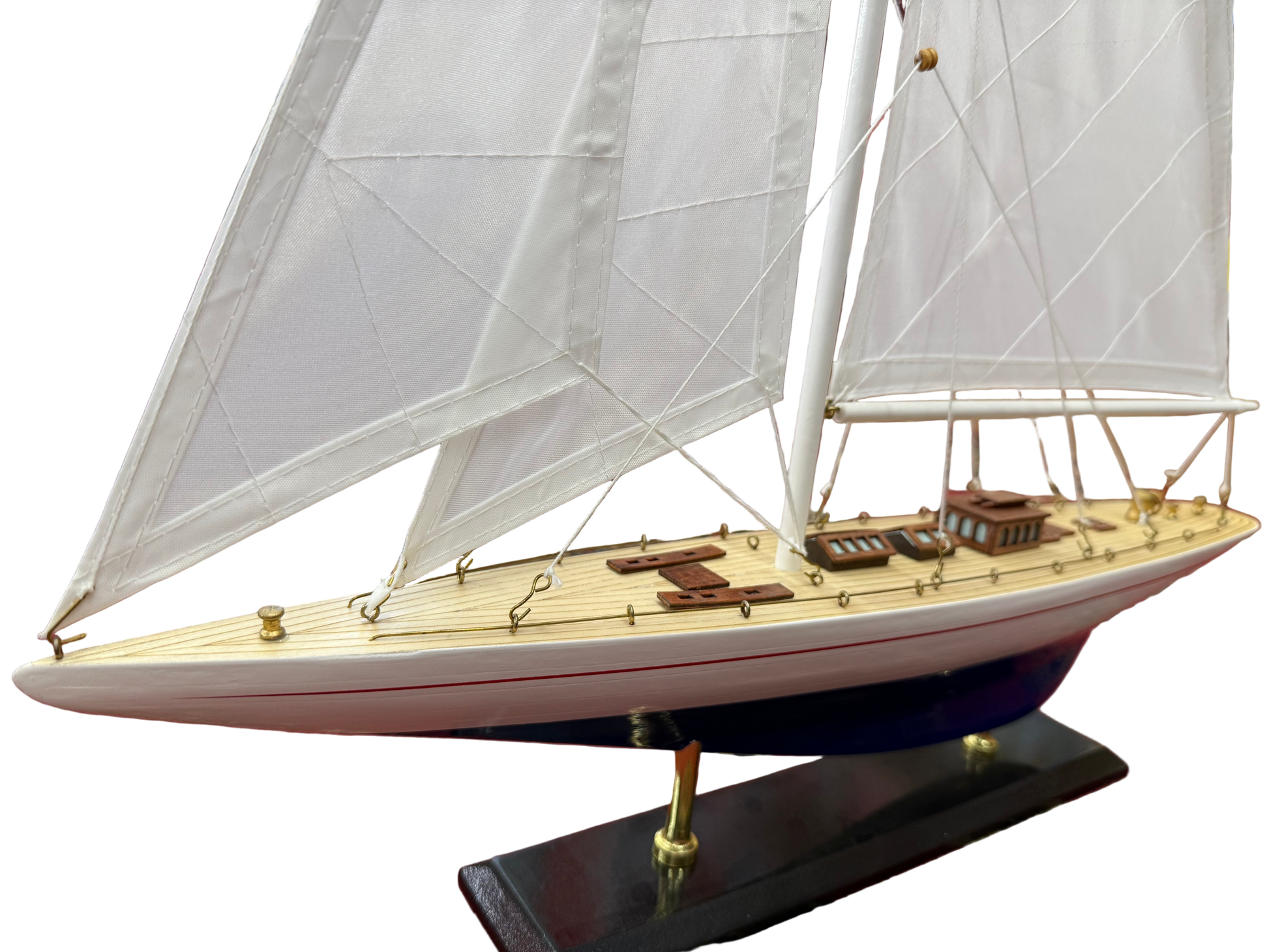 Featuring three finely tailored fabric sails, it combines traditional craftsmanship with realistic nautical design, making it a striking decorative piece or collector’s item.