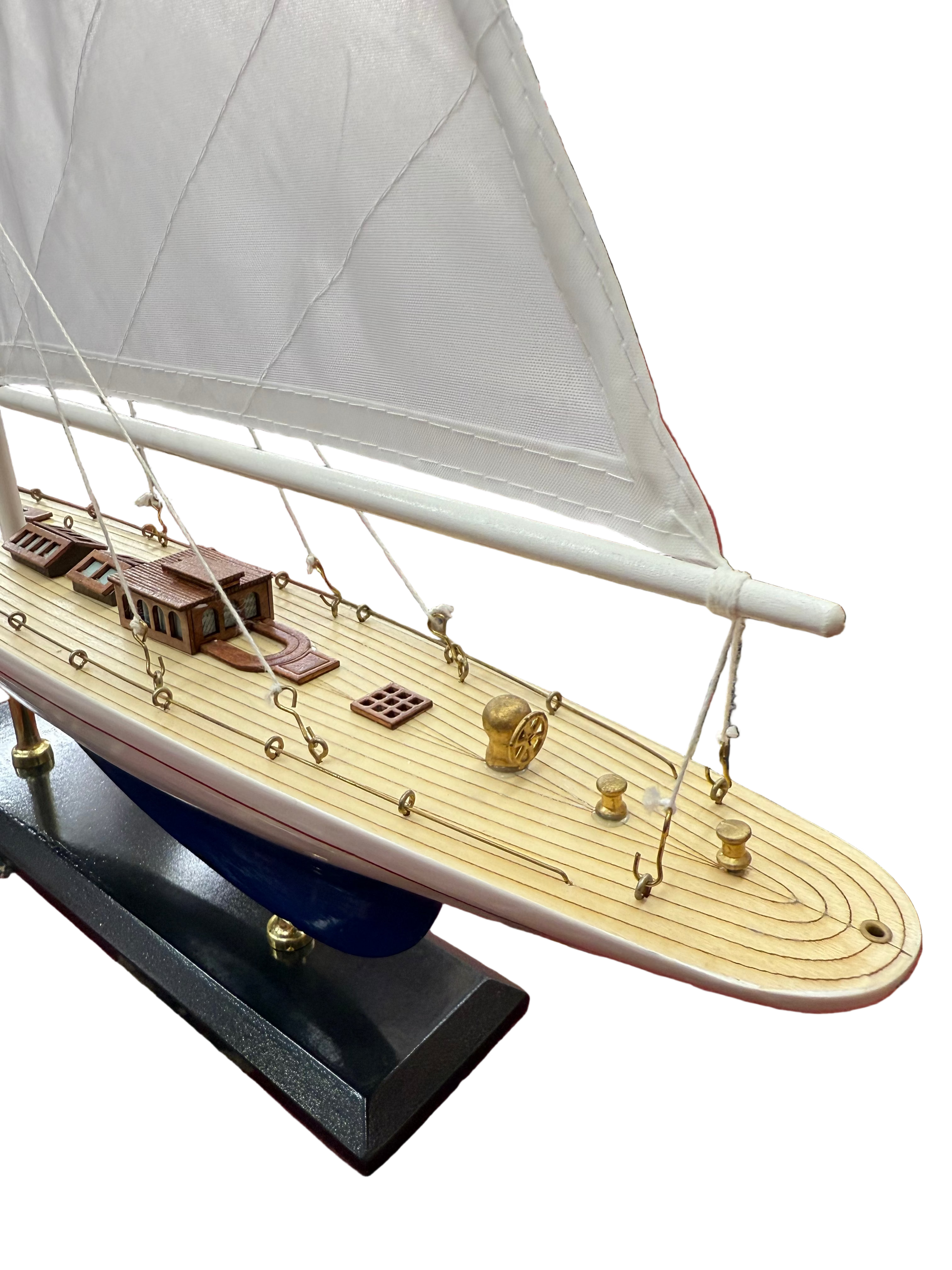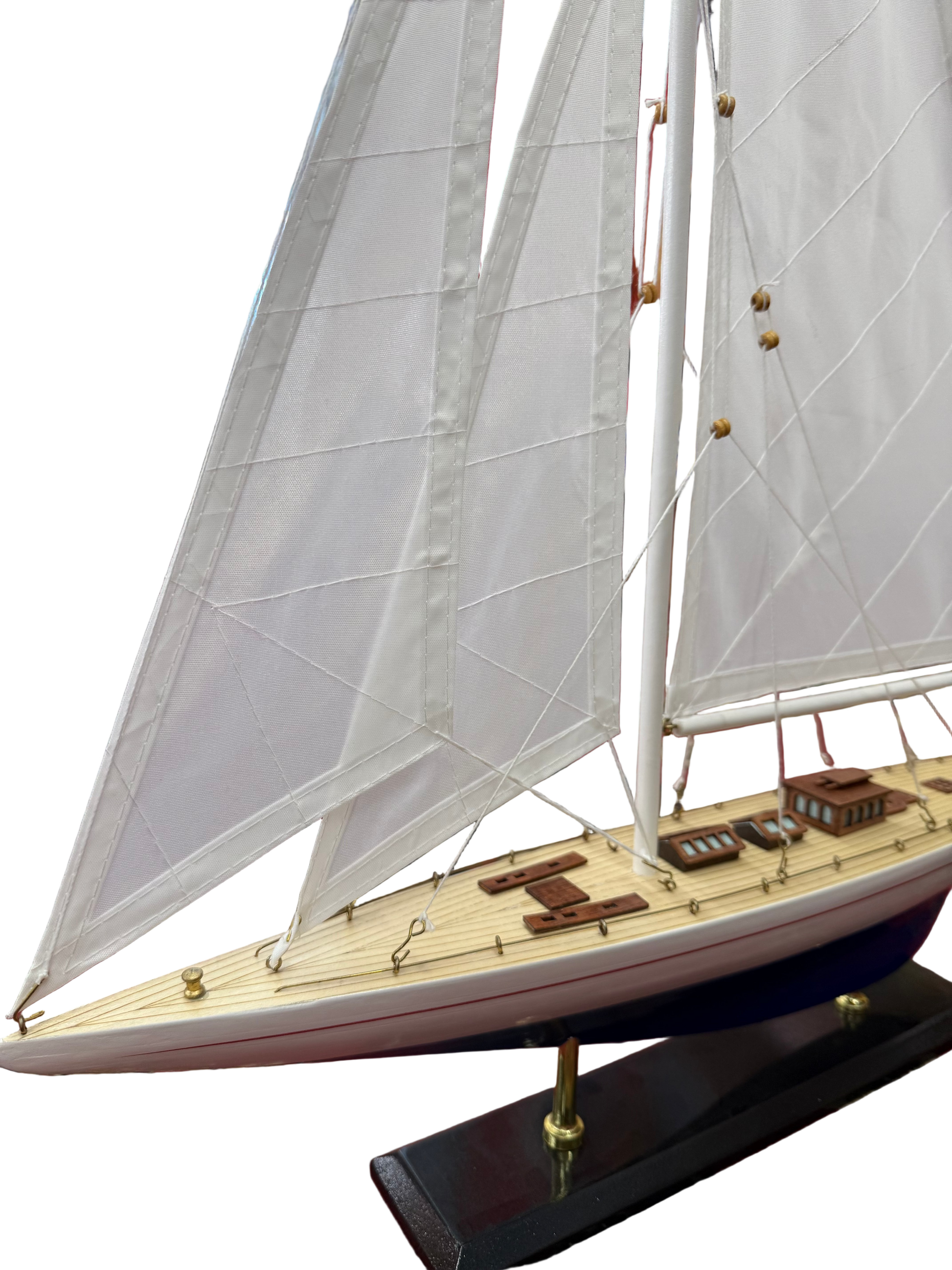 This expertly crafted giant yacht model measures 42x30x6 cm and showcases polished, painted wood with exquisite deck detailing.